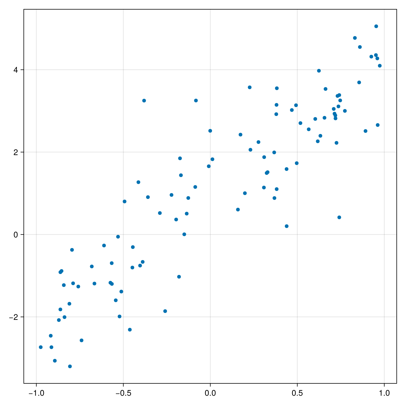 y = 3X .+ 1 + randn(n)The generated problem looks like this: