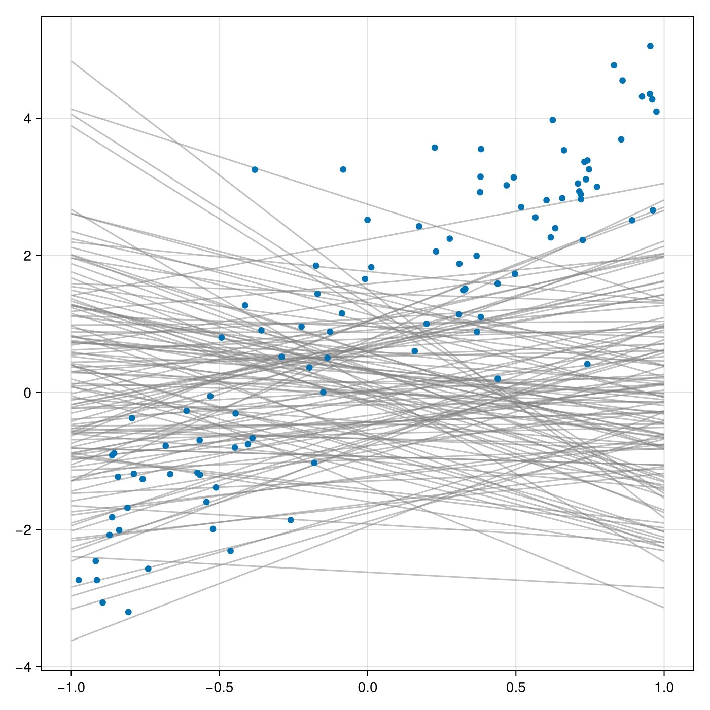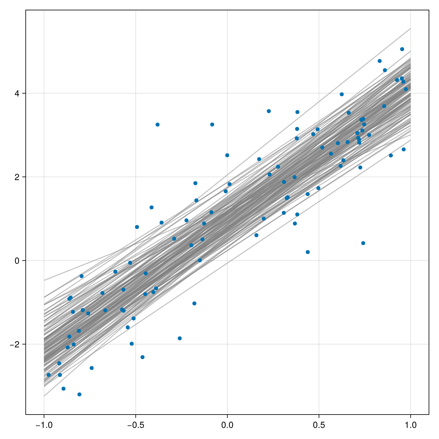 We start by defining a simple Turing.jl model for regression and instantiate it: